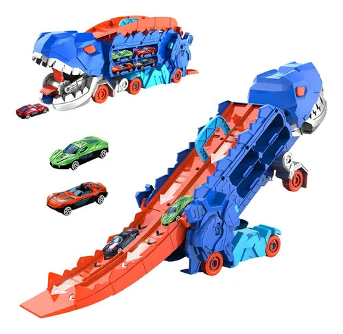 Una pista de carreras única que se transforma en un dinosaurio gigante. Los niños pueden disfrutar lanzando sus autos a toda velocidad por la rampa mientras el dinosaurio abre su enorme mandíbula para “devorar” los vehículos.